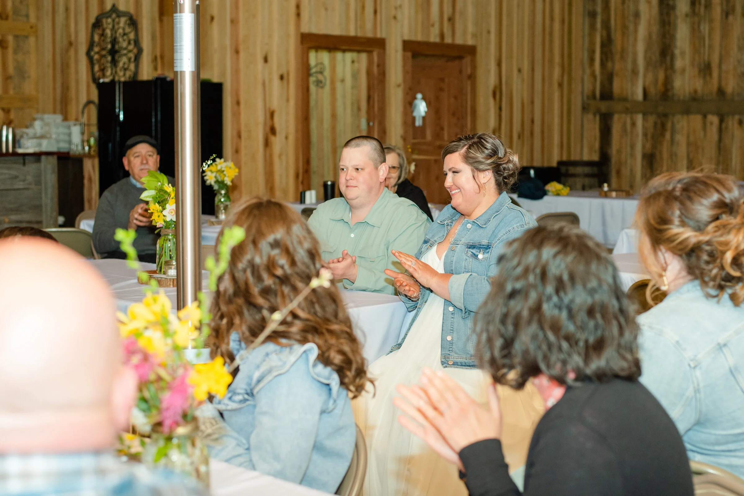 The bride and bridesmaids arrived on the day of the wedding via limo to the beautiful bridal cabin at The Cabins at King’s Mountain after having their hair and make-up done. There was so much laughter and joy as the ladies got ready for the ceremony. The groom and groomsmen got ready at the groom’s cabin, and the ceremony was held in an open field overlooking a pond. The reception took place in a beautifully decorated barn, and since there was a nip in the air still, heaters and fire pits were available to keep guests warm. The bride and flowergirl even donned jean jackets, which were perfect additions to their dresses!